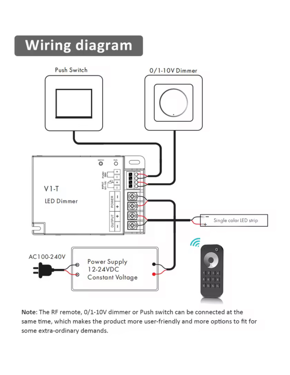 Der V1-T Controller kombiniert RF-Fernbedienung, 0/1–10V Steuerung und Taster-Dimmung in einem einzigen Gerät. Ideal für einfarbige LED-Streifen und kompatibel mit Konstantspannungsnetzteilen von 12–48V DC, lässt er sich flexibel in moderne Lichtsysteme integrieren – sowohl im privaten als auch im gewerblichen Bereich.