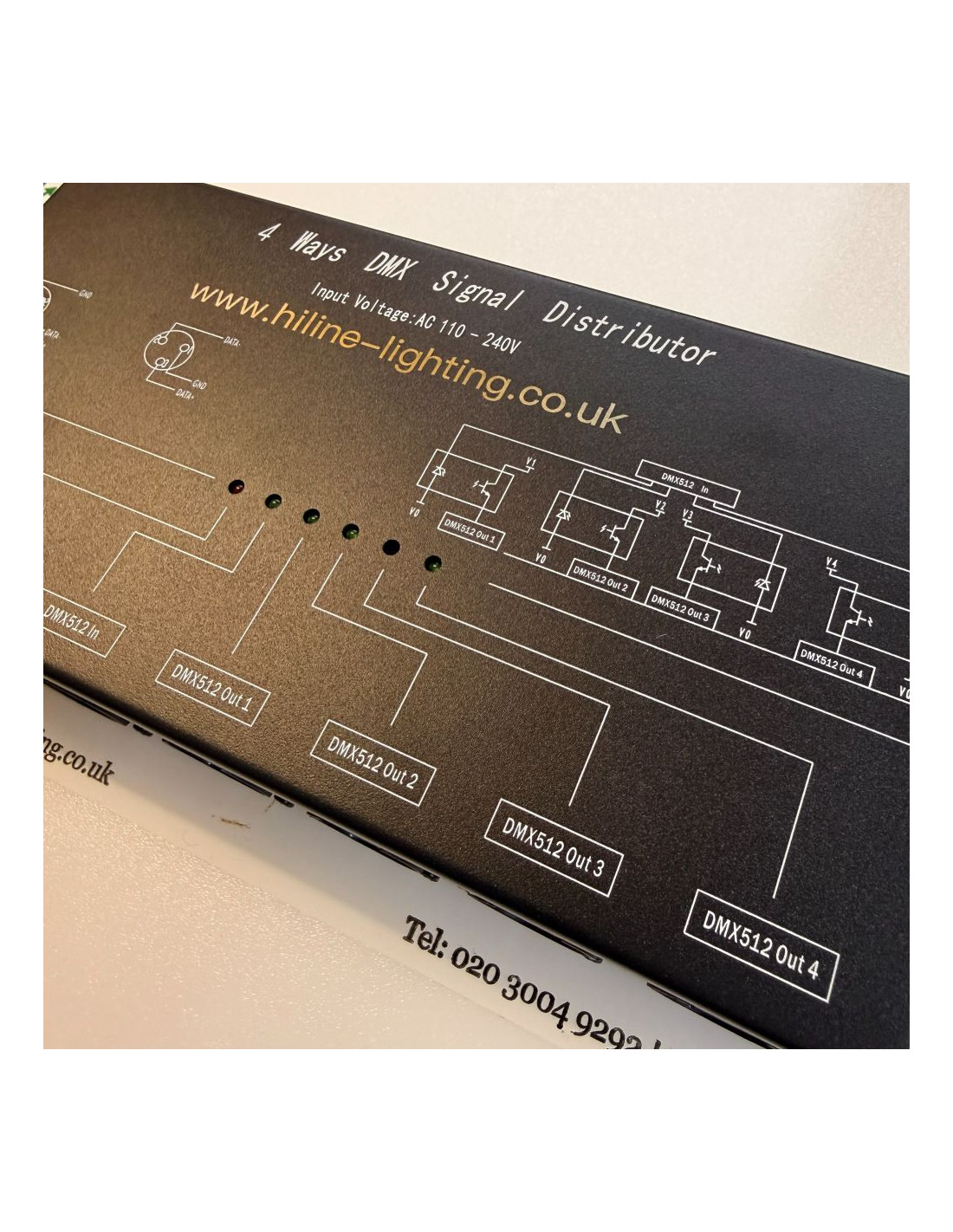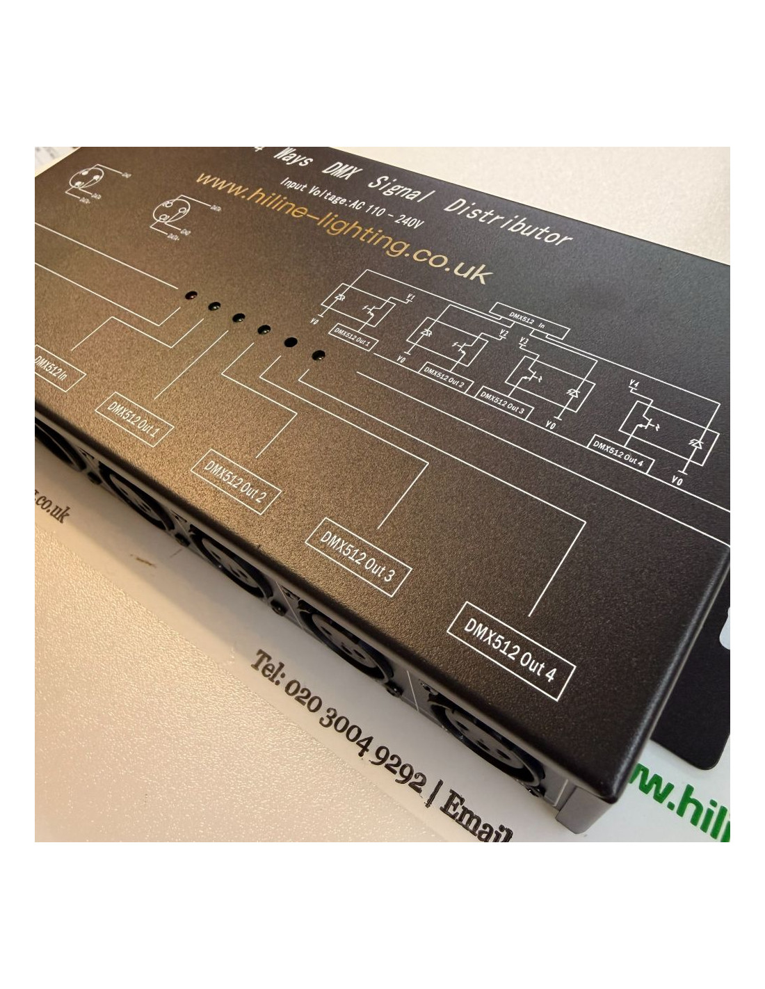 Dieser professionelle DMX512-Splitter wurde entwickelt, um eine saubere, stabile und zuverlässige Signalverteilung in einer Vielzahl von Beleuchtungsinstallationen sicherzustellen. Er nimmt ein einzelnes DMX512-Signal auf und regeneriert es zu vier vollständig isolierten Ausgängen, sodass die Datenübertragung selbst bei langen Leitungswegen, älteren Kabeln oder komplexen Installationen stabil bleibt.