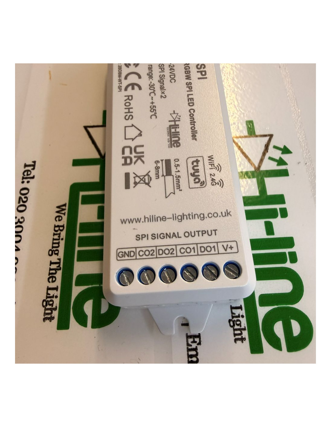 WiFi- und RF-SPI-Controller für RGB, RGBW und einfarbige adressierbare LED-Streifen. Steuerung über Tuya Smart App mit Sprachunterstützung für Alexa und Google Home. Zwei SPI-Ausgänge, bis zu 1000 Pixel, 5–24 V DC Eingang, kompakte Bauform für einfache Installation.