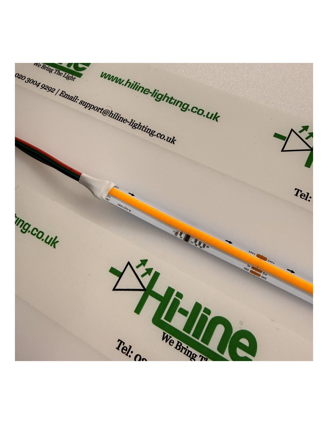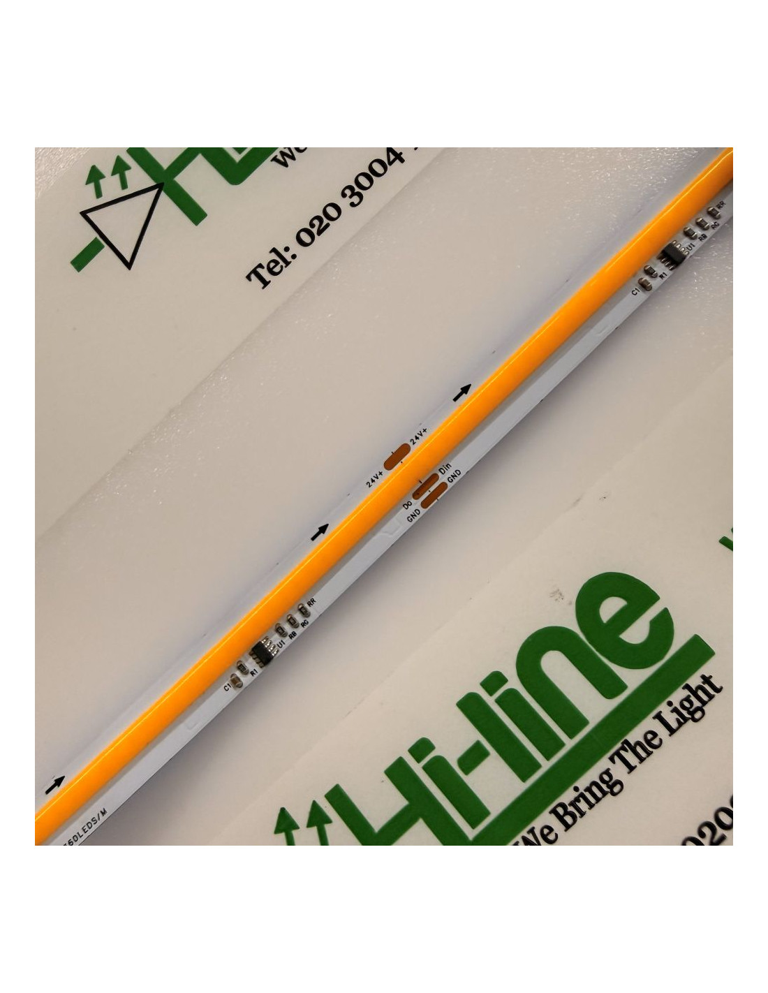 This 24V WS2811 COB addressable LED strip is designed for dynamic single-colour pixel effects such as running light, chasing, marquee, and horse-race style animations. Unlike standard constant-voltage warm white LED strips that illuminate uniformly, this product allows sections of light to be individually controlled, creating movement and visual effects along the length of the strip.