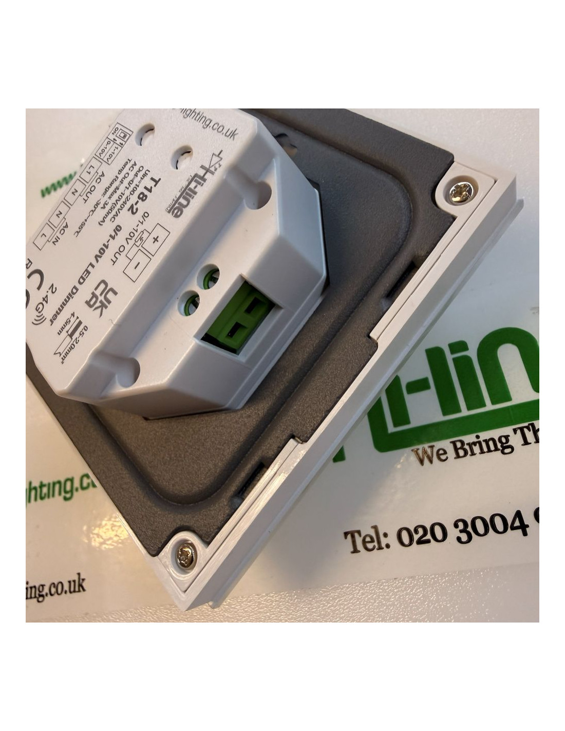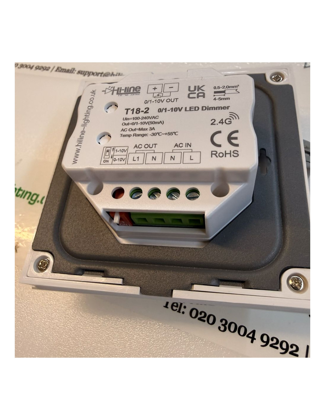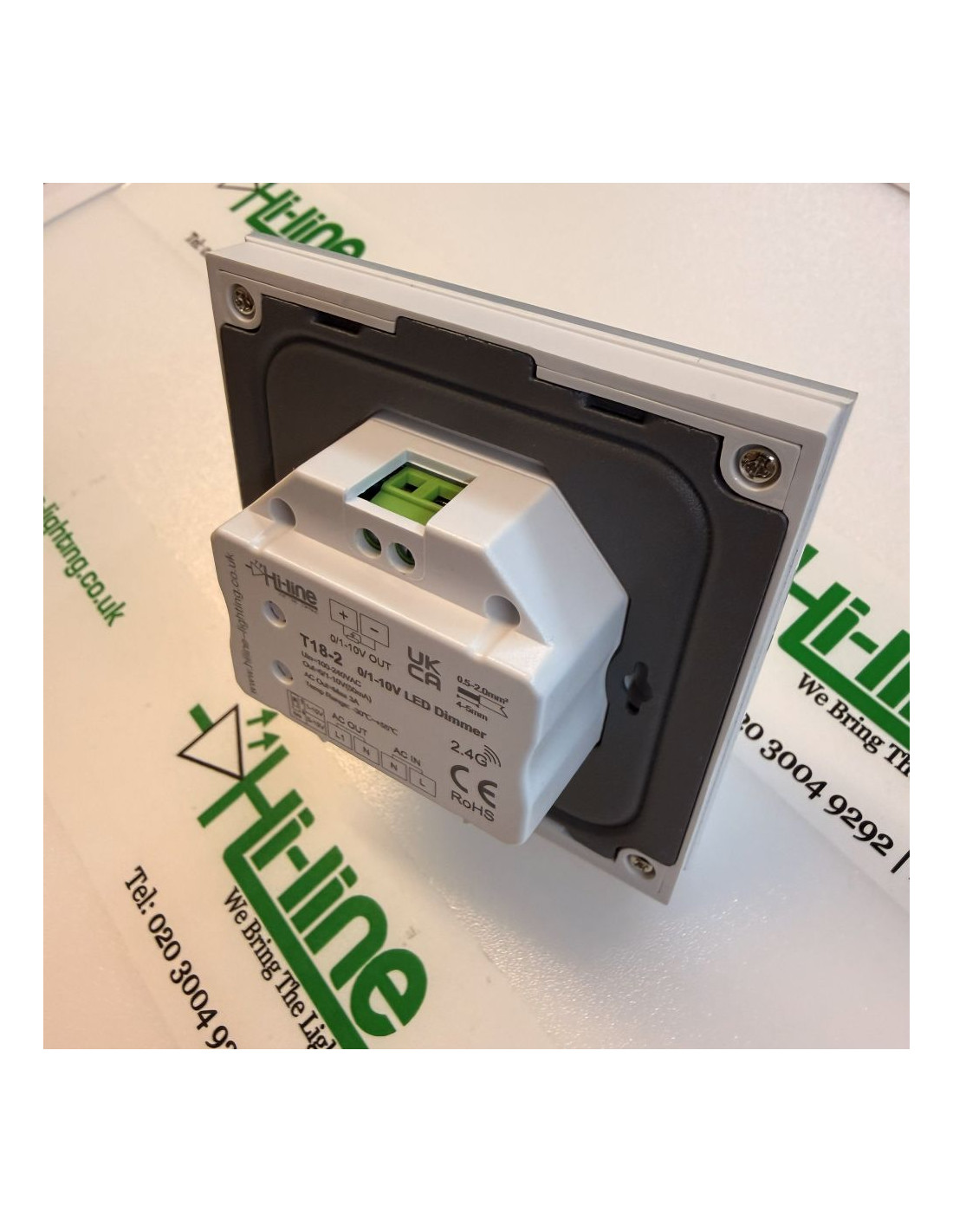 Designed to fit a standard European 86 × 86 mm wall box. The dimmer can be wired to provide only the 0/1–10V control signal, or used to switch the mains supply to the LED driver via the built-in relay. Up to 100 LED drivers can be connected to a single dimmer, with a recommended maximum control cable length of 50 metres.