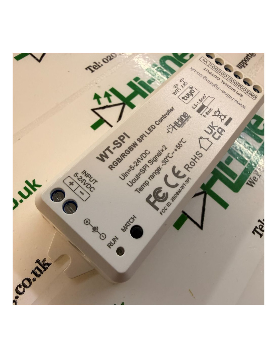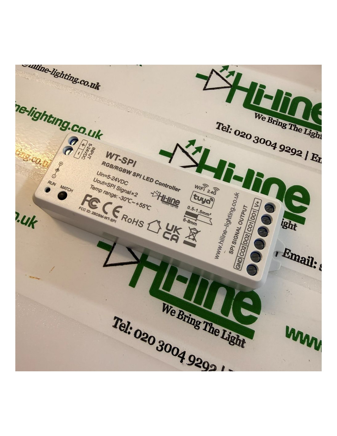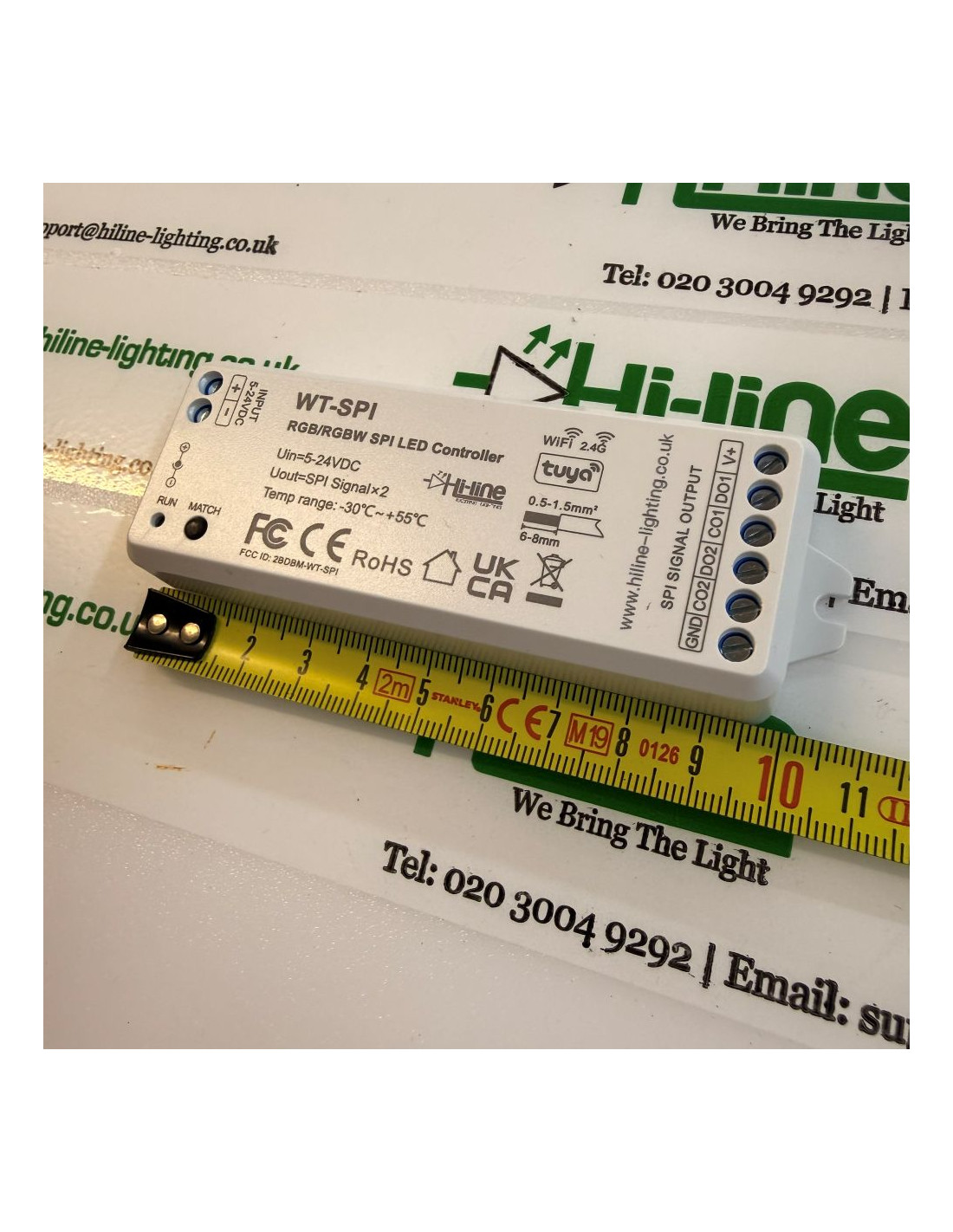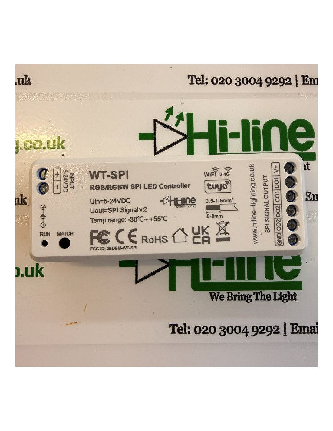 The HL-WT-SPI is a smart WiFi and RF SPI controller designed for single-colour, RGB, and RGBW addressable LED strips using a wide range of SPI chip types. It combines Tuya Smart app control, optional 2.4 GHz RF remote operation, and voice compatibility with Alexa and Google Home for convenient and flexible lighting control.