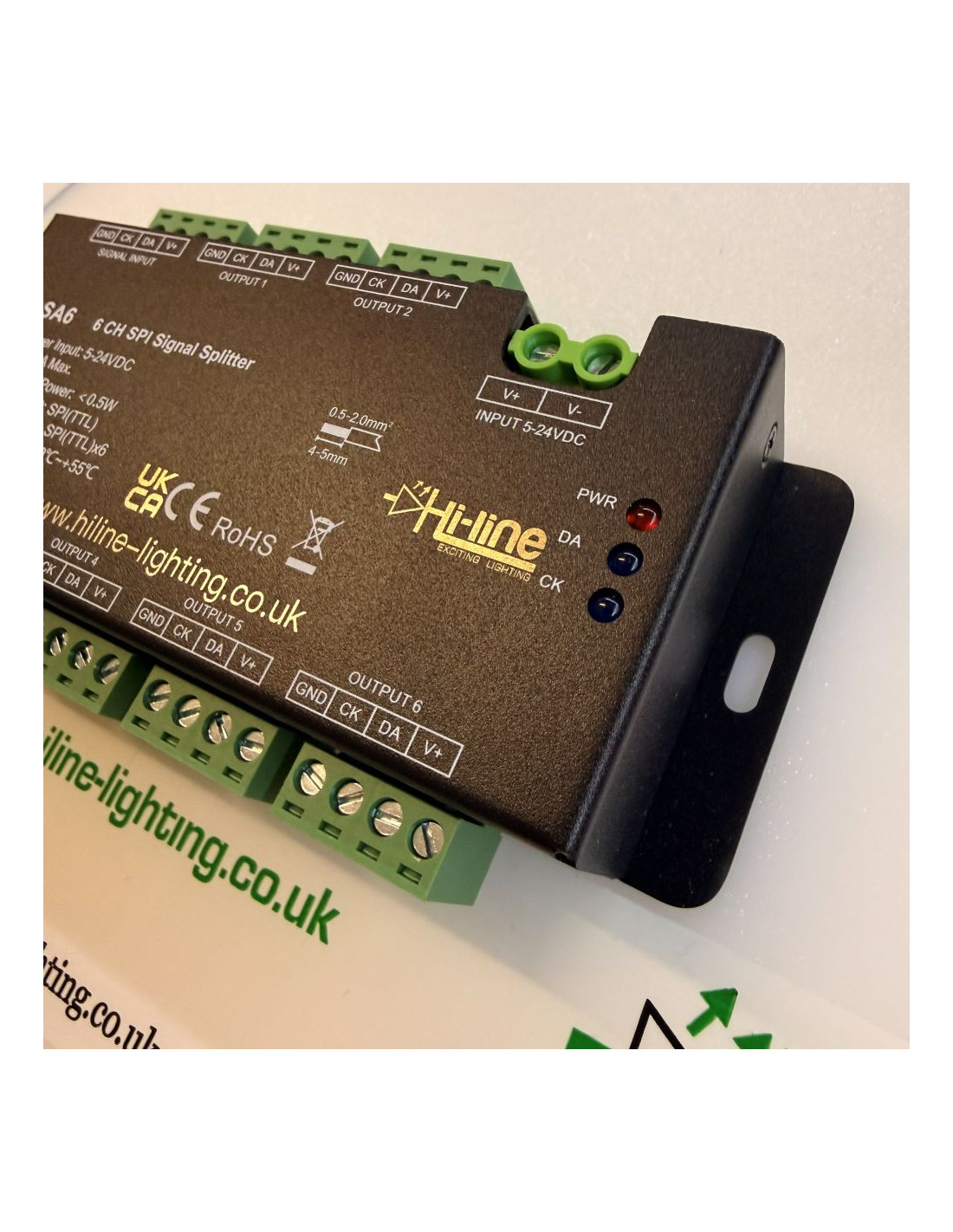 The SA6-SPI is a professional SPI (pixel) signal splitter and buffer designed for use with addressable / digital LED strips such as RGB or RGBW pixel products operating on 5V, 12V, or 24V systems.
